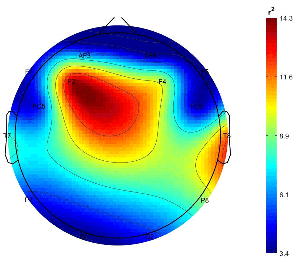 For each stimulated and non-stimulated group of participants, the scalp distributions of r2 coefficients (expressed as percentage, normalized to the total score) were drawn. Since each channel is associated with at most 65 features (as well as 65 r2 coefficients), coefficients (one coefficient for each channel) are calculated as mean value.