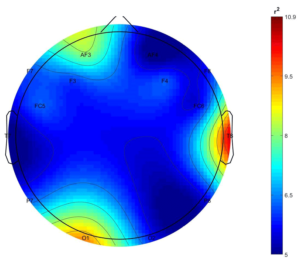 Comment. While results for the stimulated participants were as expected, those observed from non-stimulated participants were interesting. Indeed, even if the correct discrimination percentage is not particularly high, all the inferential statistics and parameter estimates indicate the presence of an EEG signal corresponding to the stimulation periods. Furthermore, the origins of these differences (see Figure 2) correspond to channels T8 and O1, which correspond to brain areas involved in processing auditory and visual information respectively.