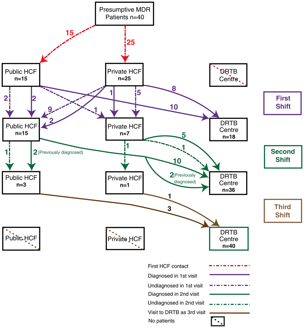 Among the 25 patients who went to the private sector at the first clinical encounter, 11 (44%) were diagnosed with MDR, and were transferred directly to the PMDT center. The remaining 14 required addition visits before MDR diagnosis (9 went to public HCF and 5 went to private HCF).