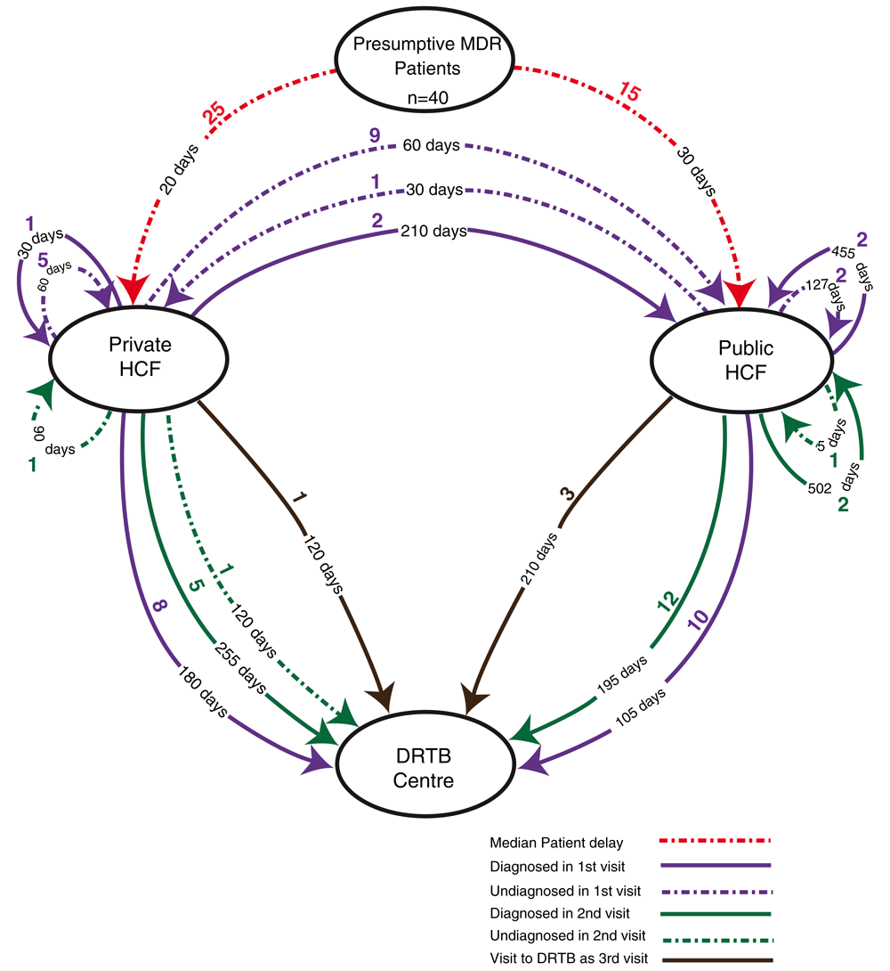 Amongst the 25 patients who went to the private sector at the first clinical encounter, 11 (44%) were microbiologically diagnosed with MDR TB, and were referred directly to the DDR-TBC. The remaining 14(66%) required addition visits before MDR TB diagnosis (nine (36%) went to public HCF and five (20%) went to private HCF).