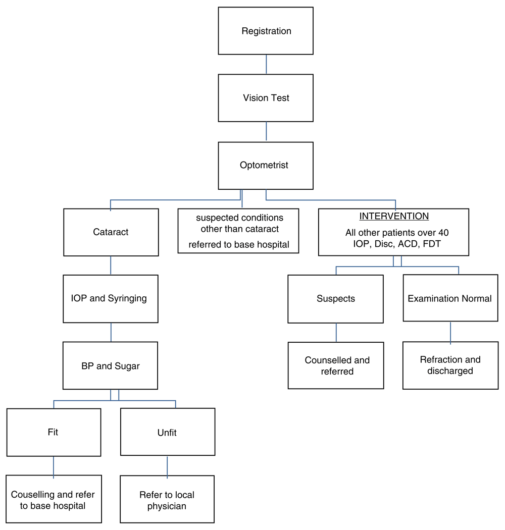 Records of each person screened would be entered Those requiring further investigations would be counselled about glaucoma and importance of early detection. They would be offered a free drop to the base hospital. Those not agreeing to travel on the same day would be given a contact number, in case they would like to report later. Those not reporting within a week would be given a reminder call.