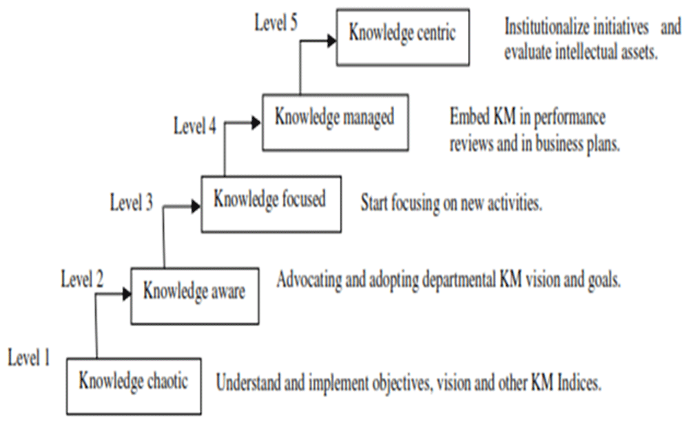 Assessment is regarded as “the first step towards improvement; one can’t improve what one can’t measure – formally or informally” (Kulkarni & Louis, 2003:2542). While Demchig7 argued that KM current status in institution should be evaluated from the starting point. Therefore in assessing the KM status in Nigerian institutions, the study adopted Frid KM Model framework because it is simple to implement. As shown in Figure 1 below, Frid KM Model is categorized into five segments ranging from level 1 to level 523 which are knowledge chaotic, knowledge aware, knowledge focused, knowledge managed, and knowledge centric respectively.
