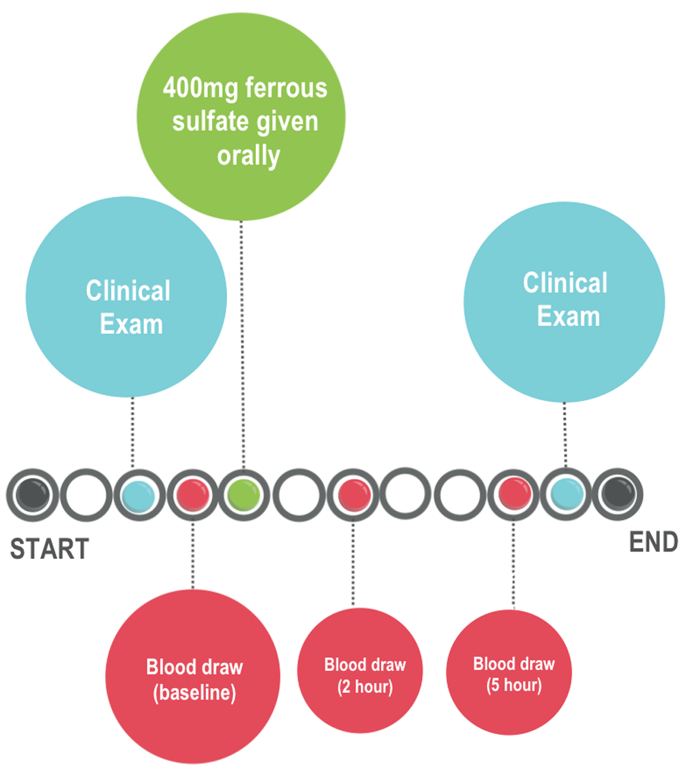 Each participant will be given a single dose of 400mg ferrous sulfate oral iron (2x 200mg ferrous sulfate tablets), equivalent to 130mg elemental iron. To ensure that the iron tablets are taken, a nurse will observe and record the time injestion. Participants will be asked to stay at the study site until the study is completed, which is after collecting the five hour post supplementation blood sample (Figure 1).