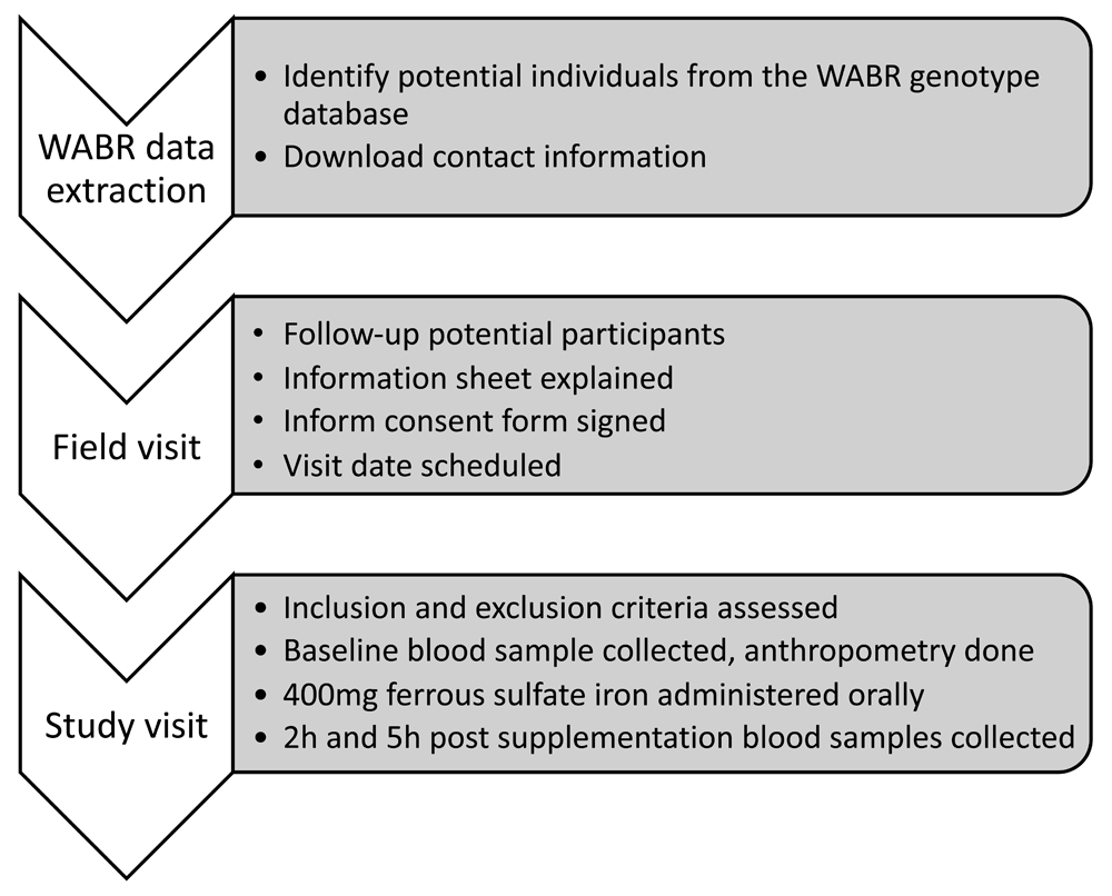 We will employ a recall-by-genotype study design, in which participant selection will be based on TMPRSS6 SNPs reported to be associated with the risk of iron-deficiency anaemia: rs855791, rs4820268 and rs223532110,14,15. We will utilize the West African BioResouce (WABR), which contains the Kiang West Longitudinal Population Study (KWLPS) as the basis for selection of pre-genotyped participants16.
