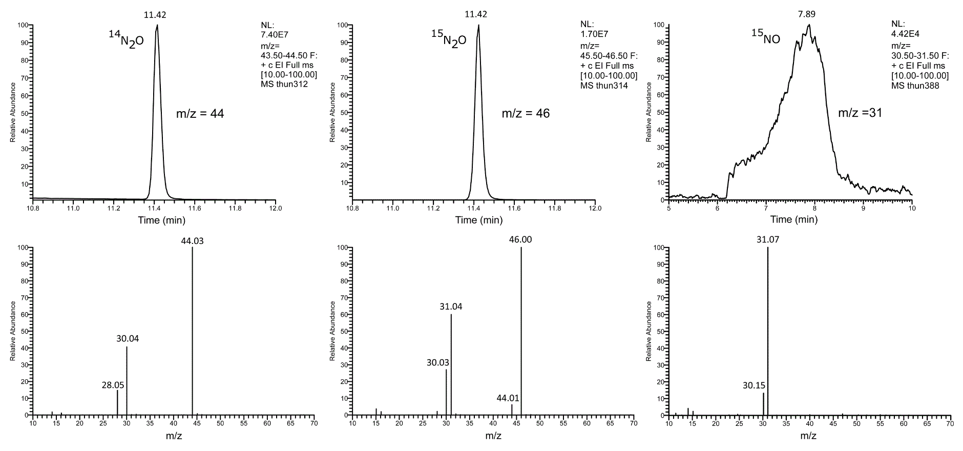 The sealed vials were placed into the incubation unit of the CombiPAL autosampler (CTC Analytics, Zwingen, Switzerland) for 60 min at 25°C and analysed with a Trace 1310 GC / ISQ quadrupole system (Thermo Scientific, U.S.A.) under the following conditions: 500 μL of headspace was injected at 70°C (split 1:20) onto a Porous Layer Open Tubular (PLOT) column (30 m × 0.32 mm inner diameter, 12 µm film thickness, HP-PLOT Molsieve, Agilent Technologies, cat. no. 19091P-MS4), Palo Alto, CA, U.S.A.). Helium (99.999%, Carbagas, Basel, Switzerland, cat. no. P6201RG) was used as carrier gas at a constant flow rate of 1 mL/min. The oven temperature was programmed from 70°C (5 min) to 220°C (3 min) at 30°C/min. The quadrupole detector was set in the electronic ionisation mode (full scan 10–100 amu) with selected-ion monitoring (70 eV, ion source = 170°C, delay = 2.5 min) with a transfer-line to the GC (1 m fused silica deactivated, 0.25 mm i.d.) at 290°C. Specific masses for the detection were m/z 30 for NO (m/z 31 for 15NO) at a retention time of about 7.9 minutes and m/z 44 for N2O (m/z 46 for 15N2O) at 11.4 minutes.