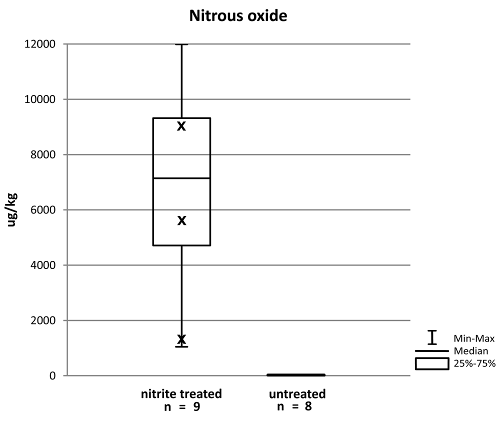 Both carbon monoxide and nitric oxide are bound in the sample as a ligand. Their release is enhanced by adding sulfuric acid. Being a free radical, however, nitric oxide is far more reactive than carbon monoxide: Instead of a sharp symmetrical peak, chromatograms show nitric oxide as a broad hump, barely distinguishable from baseline noise. The direct approach therefore is not feasible. In an acidic environment, however, two NO molecules, upon reduction, react to nitrous oxide (N2O), which shows up as a perfect peak in the chromatogram (Figure 2), allowing for the indirect detection of NO. For the purpose of identifying nitrite treatment, a semi quantitative assessment of N2O proved to be sufficient, as any clear signal is alone due to a former nitrite treatment.