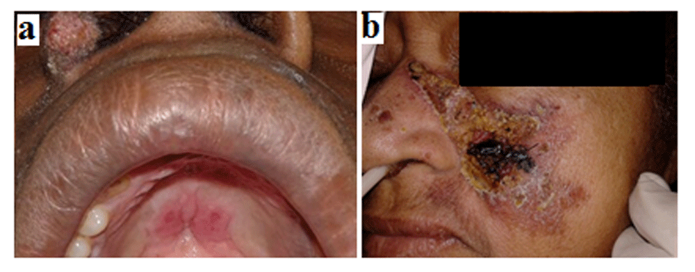 Ulcerated oral lesions in hard palate reported at Case-5 (a). Leishmaniasis lesion in the left malar region reported at Case-6 (b).