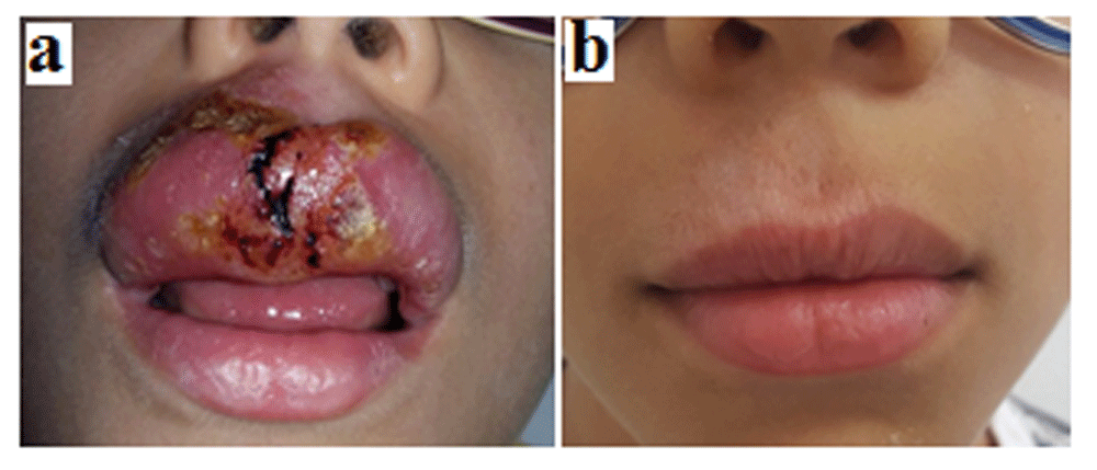 In 2017, an eight year-old Caucasian male from Salvador, Bahia, Brazil, presented with a hyperemic and pruritic lesion on the upper lip which had persisted for six months. Patient was treated with acyclovir cream, 5%, 5 times/day and cefadroxil (50 mg/kg/day) for seven days, with no response. He presented worsening of the lesion and Montenegro intradermal examination was performed (Figure 2a). The patient was positive for American Tegumentary Leishmaniasis. Treatment with glucantime (10 mg/day) for 20 days was initiated. After three days of treatment, the patient developed vomiting episodes, intermittent fever, diarrhea, hypoglycemia, dark urine, and began developing a reaction of cardiotoxicity and hepatoxicity. Treatment with liposomal amphotericin B was initiated (3 mg/kg/day for 5 days, followed by 3 mg/kg). One month later, patient was discharged with remission of the lesion (Figure 2b). Two months later, the patient was admitted at University Hospital with a new, erythematous and ulcerated lesion on the upper lip lesion, lymphadenopathy, and facial edema. Therapy with amoxicillin 250 mg (1g/day) and amphotericin B (100 mg/day) for 10 days was started. Patient is currently in psychological follow-up due to trauma caused by facial disfiguration and difficulty in returning to social life. Patient maintained outpatient follow-up and did not present with recurrence of the lesion.