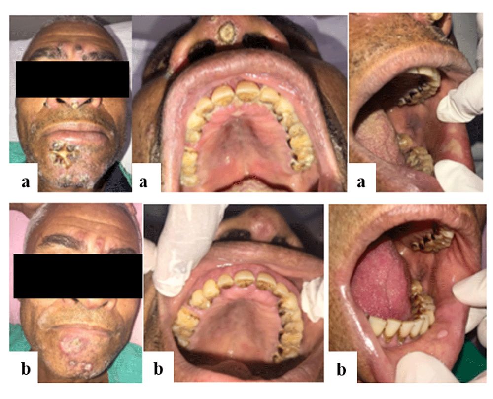 Ulcerated oral lesions in hard palate reported at Case-5 (a). Leishmaniasis lesion in the left malar region reported at Case-6 (b).