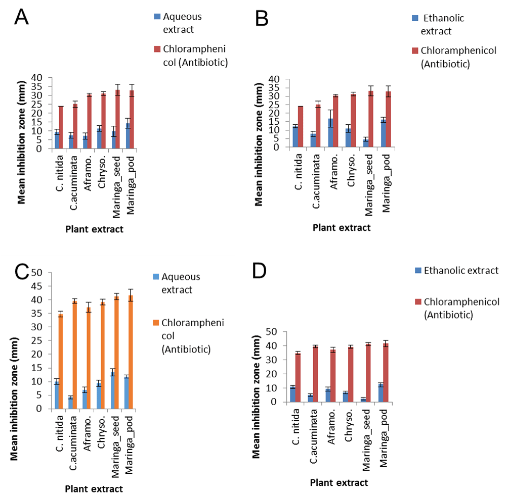 The plant extracts investigated showed various degrees of antimicrobial activity against the target bacterial organisms. The observed zone of inhibition from the edge of each well differed from one target organism to the other. Raw data for zones of inhibition are available on OSF (Nwonuma, 2019). All the plant extracts assayed showed mild inhibition activity compared to the positive control (Chloramphenicol), to which the target bacteria were radically susceptible to (Figure 1). The negative control wells, containing normal saline solutions, showed no inhibitory activity. Plant extracts derived using ethanol solvents showed better inhibitory capacity than the aqueous extracts against Pseudomonas aeruginosa. In addition, Pseudomonas aeruginosa was the most susceptible target bacterium to the plant extracts used for the study. A susceptibility contrast was, however, observed for Proteus mirabilis treated with the aqueous extracts of Cola nitida. Similarly, the aqueous extracts of Chrysophyllum albidium at 400 mg in 1 ml of distilled water had the best inhibition activity against Pseudomonas aeruginosa and Proteus mirabilis (11.3 mm and 9.4 mm) respectively. The highest inhibitory activities were observed for the ethanol extracts of Cola nitida (11.8 mm), Aframomum melegueta (15.8 mm) and moringa pod (13.4mm) against Pseudomonas aeruginosa. The susceptibility results obtained for both aqueous and ethanol assays of investigated plants on Proteus mirabilis vary and were consistently low.