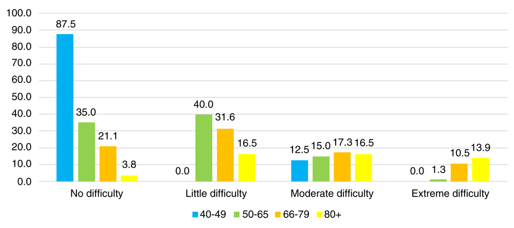 From the age of 50 onwards, a majority of patients felt they had difficulties with using technology. This clearly increased with increasing age, with 13.9% of those over the age of 80 having extreme difficulties.