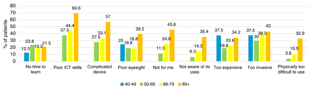 In general the uptake and use of technological devices by older patients is high. It drops in patients over the age of 80, but it is likely that this can at least be combatted by better education and training and targeting software to devices in widespread use.
