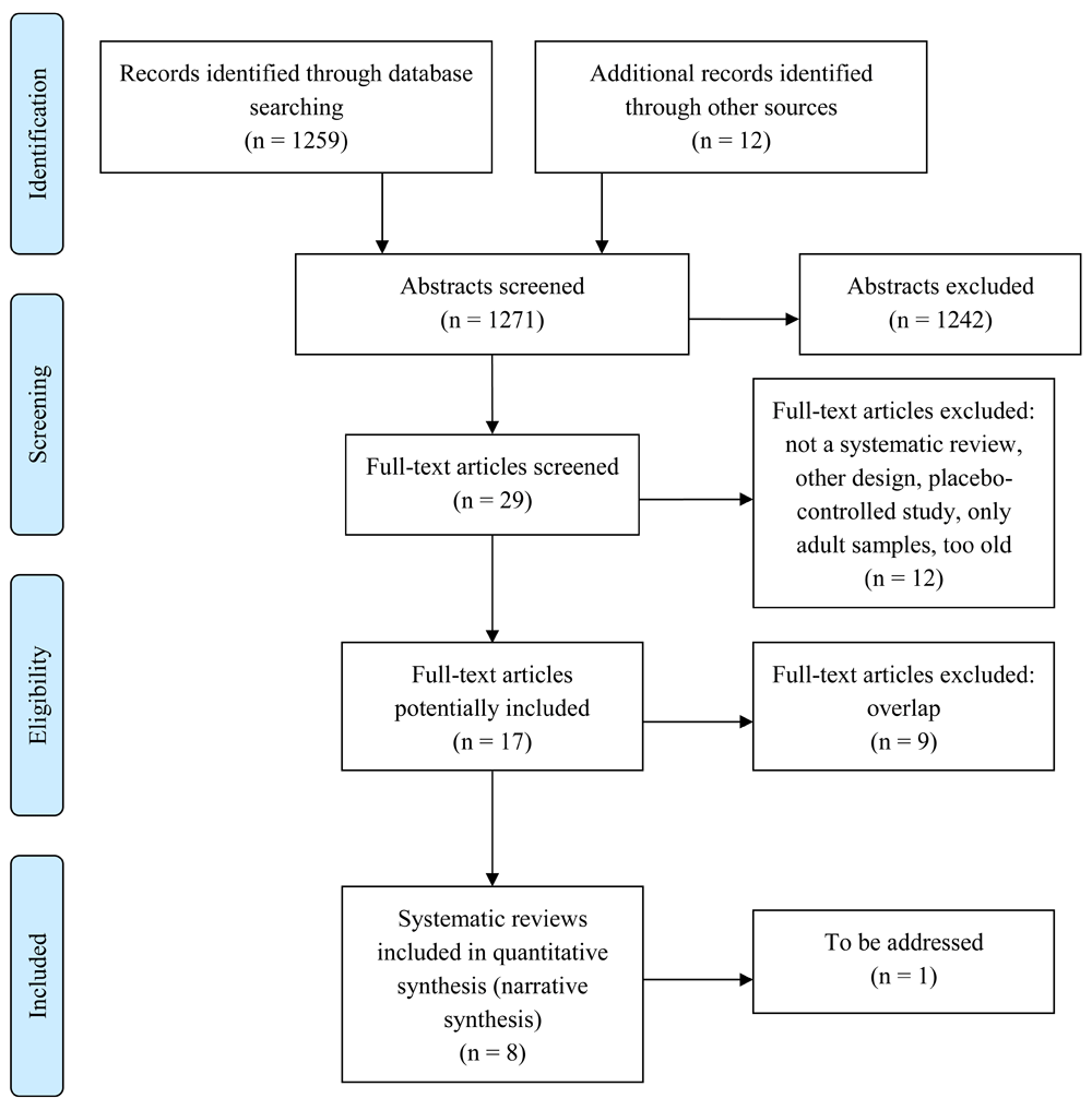 We sorted all included reviews by population and which interventions were compared (the PICOs). In cases were more than one review addressed the same treatment comparison for the same population, we included the review with the newest search (and completeness of this search by considering the included studies) and the best quality. In considering overlap, the first author (ISM) extracted this information from the reviews and the second author (AA) double-checked this information. Further, we assessed the quality of the included reviews based on a checklist for systematic reviews (AMSTAR: A MeaSurement Tool to Assess systematic Reviews)24. Two people (ISM, IB) considered each publication independently and decided on the methodological quality through discussions until consensus.