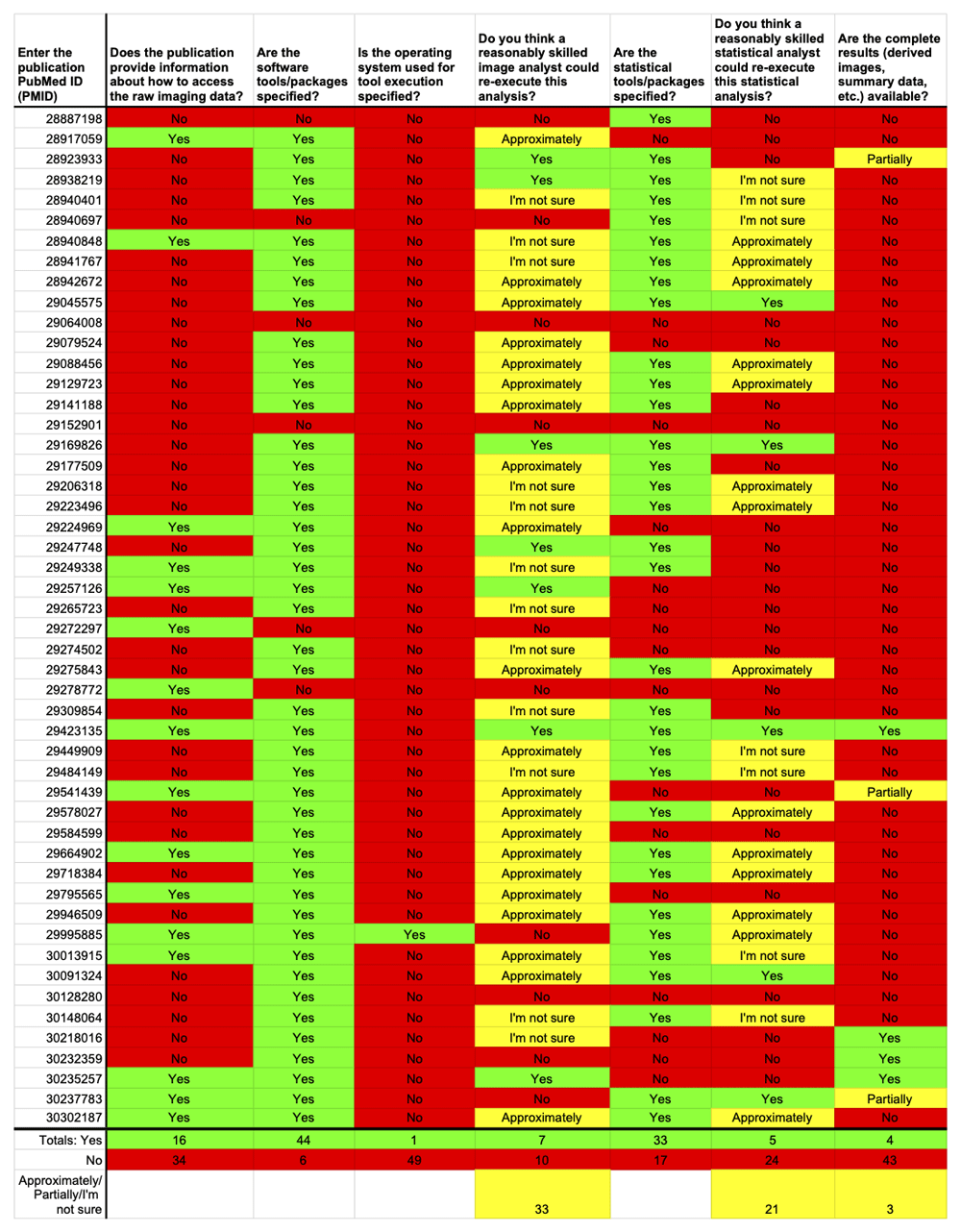 There is a distinct difference between the theoretical and practical ability to reproduce both the image analysis and statistical analysis. While the software packages used for the image analyses are specified in nearly all the cases, only some give the rater confidence that a skilled analyst could actually re-execute the analysis. Similarly, for the cases where the statistical tools are specified, only a handful are descriptive enough to give confidence in re-executability.
