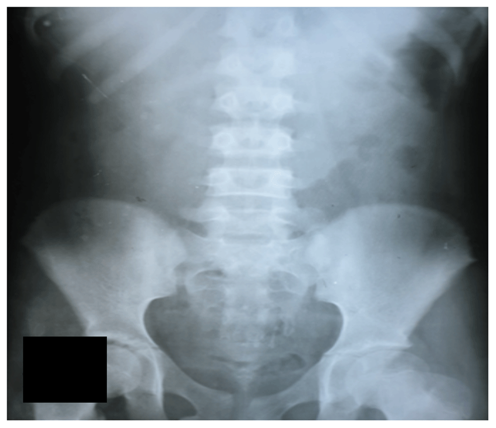 A 13-year-old girl presented to the emergency room of our hospital with a complaint of abdominal pain for six days. She had a history of eating 30 ayurvedic digestive tablets to relieve her indigestion 1 day prior to the onset of abdominal pain. The pain was moderate to severe in intensity, more in the umbilical region, non-radiating, associated with vomiting, and refusal to feed. The patient was taken to a local hospital where intravenous antiemetic dimenhydrinate 50mg stat was given, along with intravenous fluids. An X-ray of the abdomen was done at that time showing distended bowel loops with significant fecal impaction. The patient was given laxative sodium picosulfate 7.5mg stat and discharged after 4 hours.