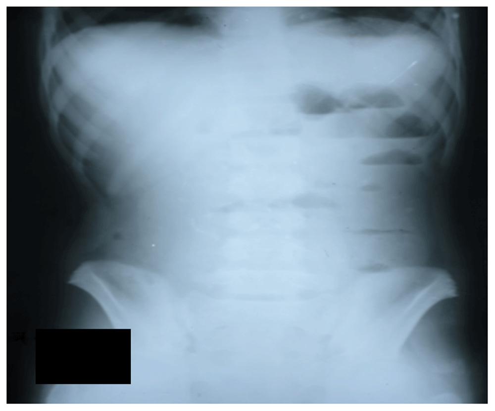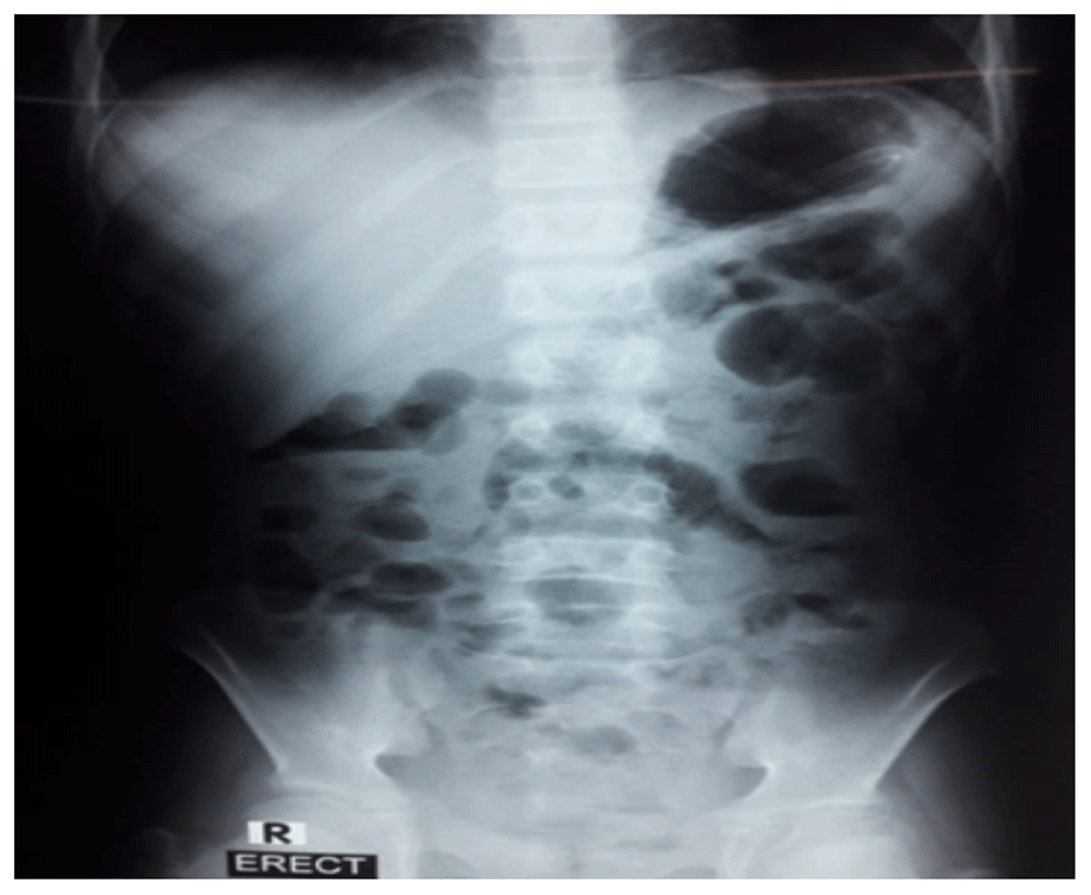 Two days later, the patient developed persistent vomiting along with constipation. She was taken to another local hospital where an X-ray of the abdomen was performed showing multiple air-fluid levels. The patient was restricted to oral intake both solids and liquids, an intravenous line was maintained, intravenous fluids and antibiotic ceftriaxone (2 gram once daily) were given, and a nasogastric tube was passed. Surgical opinion was sought at this time and surgical exploration was planned; however, this was refused by the family and the patient was taken to our hospital next day.