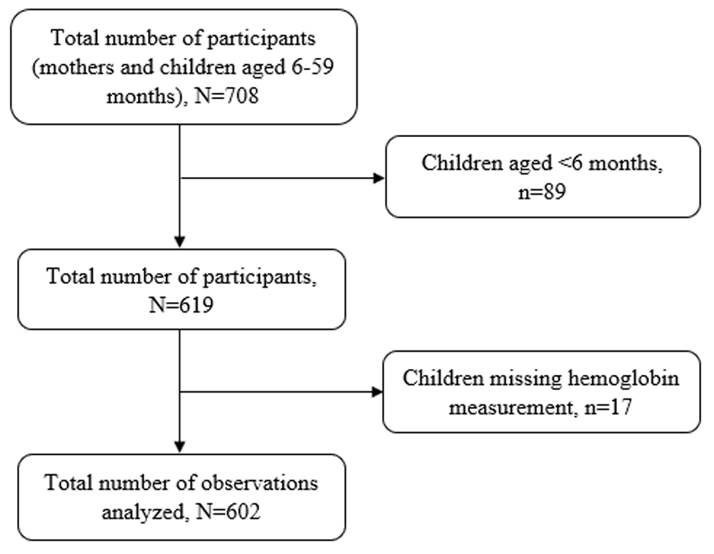 Multistage sampling technique was used to select 708 mother-child pairs from households with children aged 6–59 months. Villages were randomly selected from a random sample of wards. A listing of households with children under five years was generated with the help of ward/village and street leaders or link persons, followed by a random selection of households. When the visited household had no child under five years of age, the next household was selected until the minimum required sample size was reached. If there were more than one child aged 6–59 months, the younger one was selected to represent the rest of the children in the household. If the child’s mother was not at home, the research team visited the house for a minimum of three times before declaring that the participant could not be reached. After excluding 89 children aged <6 months, 17 children missing hemoglobin concentrations; we analyzed data for 602 mothers-child pairs Figure 1.
