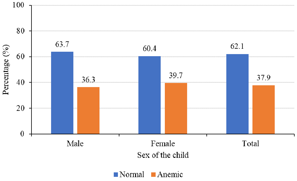 The mean (SD) hemoglobin level of children aged 6–59 months in this study was 11.2±1.6g/dl while prevalence of anemia (hemoglobin level less than 11g/dl) was 37.9%. Prevalence was slightly higher among females (39.7%) compared to 36.2% among males Figure 229, but this difference was not significant (p=0.40). Prevalence was much higher among children aged 6–23 months (48.1%) compared to 28.5% among those aged 24–59 months Figure 329. This differences in the prevalence by age was statistically significant (p<0.001).