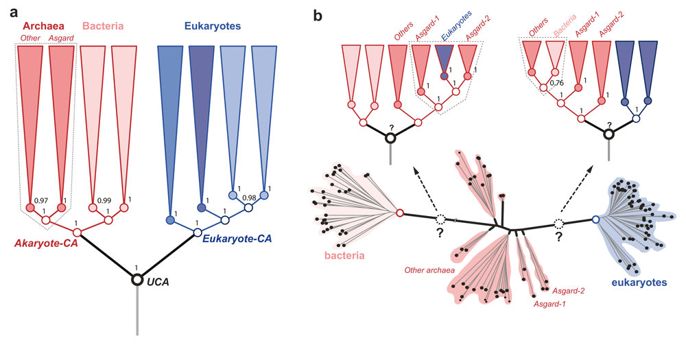 (a) The rooted tree (phylogeny) inferred by estimating the evolution of species-specific changes in protein domain composition. Directional character-evolution models place the root between eukaryotes and akaryotes. Named groups of organisms, including Asgardarchaeota are resolved into clades (i.e. a single ancestor). The Asgard archaea are sister to all other archaea, with euryarchaea being the closest relatives. The phylogeny shown is a condensed form obtained after collapsing the clades of the full tree shown previously1. (b) The unrooted tree inferred by estimating the evolution of protein/gene-specific changes in amino acid composition. The unrooted-tree is the same as in Figure S8d in the article by Williams et al.4. The group archaea, and Asgard archaea are unresolved; and a distinct archaeal ancestor is absent. Time-reversible character evolution models cannot identify the root (the universal common ancestor (UCA)) as well. Alternative rootings polarize the branching order in opposite directions implying incompatible relationships among the major organismal clades. Regardless of the rooting, neither Asgard archaea nor archaea as a whole can be resolved as a monophyletic group. Further, Argards do not share a unique common ancestor with other archaea. Even the best-fitting amino acid evolution models cannot resolve the archaeal radiation despite employing thousands of genes4. The poor resolution of archaea is seen in virtually all trees, with or without inclusion of long branches of bacteria. In such ambiguous cases, “character polarization” as in (a) is likely to be efficient, rather than the more commonly used “graphical polarization” of unrooted trees. Clade support is indicated for key groups as (a) Bayesian posterior probability, (b) bootstrap percentage.