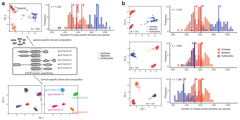 (a) Protein-domains are considered to be independent evolutionary units with a distinct tertiary fold, amino acid sequence and biochemical function. The majority of proteins are multi-domain proteins formed by duplication and recombination of domain units. Covariation of protein-domain composition among the 125 species sampled by Williams et al.4 (top) was compared by principal component analysis (PCA). Each circle in the PCA projection (top left) is a distinct species, defined by a species-specific domain cohort. Asgards are highlighted as filled circles. The frequency distribution (top right) shows the number of distinct protein-domains per species. Vertical intersecting lines in the histograms are the median numbers of protein-domains. Protein domain composition is characteristic of clades of species (top left). In contrast, covariation of amino acid composition (bottom) in a single-domain (super)family is not clade-specific, but gene family-specific. Multiple sequence alignments of a single domain (c.37.1) shared by 5/50 concatenated orthologous gene families from 125 species were sampled for the PCA projection. (b) Effects of severe perturbation of the domain composition in recovering clade-specific distributions was tested in a sample of 141 species. Although it is common to suspect that the rooting between akaryotes and eukaryotes could be biased due to a larger domain cohort in eukaryotes4, it is not the case2,3,12. Diversity of clade-specific domain composition (top right) measured simply as the number of protein domains4 is a poor descriptor of heterogeneity, and can be misleading. Clades are grouped by covarying “protein-domain types”, but not by numbers alone. The rooting is stable and the tree topology is virtually identical even after reducing the eukaryote cohort by 1/3rds (middle) or 2/3rds (bottom)8 of the original composition2. Description of the PCA projections and frequencies are the same as in (a).