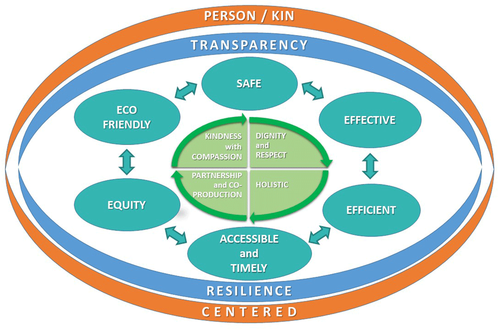 The original model had person-centred care as one of the domains. We wish to further develop this by recognising the shared humanity of the people involved. The word “kin” is introduced to embody the social relationships and lived realities that surround the individuals involved, both those providing care and those receiving care. Healthcare service is not only about the person as patient or professional, but also about their family and wider social relationships. The dimension person/kin-centred surrounds every domain and is part of all that we do. The need for this approach has been demonstrated to be an essential component of the response to the pandemic. John Ballatt and colleagues suggest that “kindness [kinshipness] is ...not a ‘nice’ side issue, it is the glue of cooperation required for progress to be the most beneficial to the most people”45.