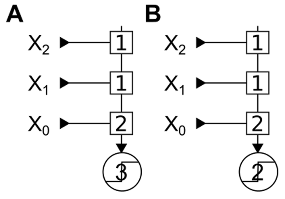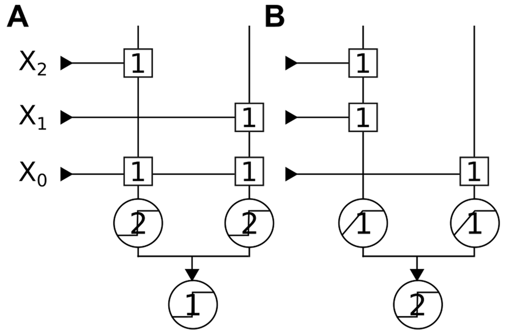 Implementations of the D-AND where X0 is the dominant input. Squares represent synapses with their synaptic weight, and circles stand for transfer functions. Here, the transfer functions are threshold functions with the given value as their threshold. A: Implementation of the D-AND, note that X0 has twice the synaptic weight compare to the others. B: Implementation of the D-OR, note that we keep the same synaptic architecture and we only change the threshold of the transfer function.