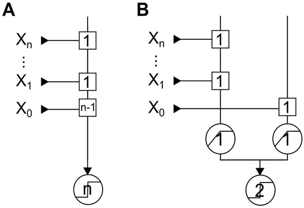 Squares represent synapses and circles represent transfer functions and their respective threshold/saturation values. Note that the final transfer functions (“somatic integration”) are always threshold units, whereas the transfer functions of the sub-units (“dendrites”) are threshold functions as an example for supra-linear summation in A, and saturating functions as examples of sub-linear summation in B. A: D-AND Implementation using supra-linear summation. Note that X0 has two synapses and therefore a synaptic weight of two. B: D-AND Implementation using sub-linear summation. Here, all inputs have identical synaptic weights.