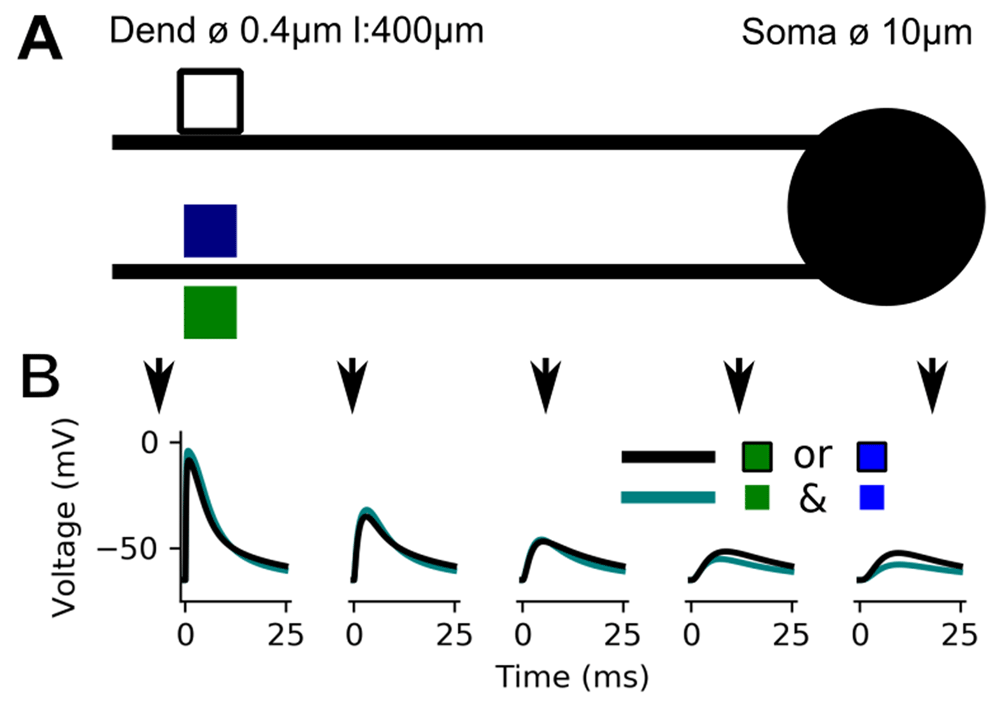 Figure 4A presents a single neuron biophysical model implementing this function. One synapse comes from an input encoding for the shape of an object, and this synapse connects to the upper dendrite. The two others encode for two different colours, either green or blue, and they connect to the lower dendrite. All the synapses, taken individually, produce the exact same depolarisation at the soma because we place them at the same distance (350 µm) and give them the same maximal conductance (20 nS).