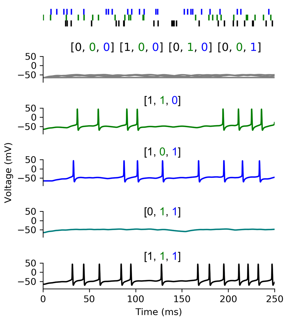 Bottom: Eight somatic membrane responses depending on the active inputs. (gray: no synapse/only black/green/blue, green: black + green, blue: black + blue, aquamarine: green + blue, black: all inputs active). Note that this activity reproduces the truth table from Table 2.