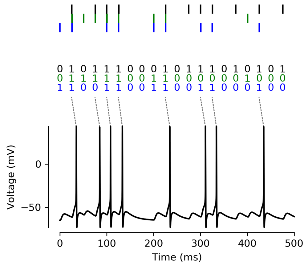 The biophysical model receives input from three sources, where activation happens at regular intervals of 25 ms, with a random jitter of ±1 ms for each spike. We translate this activity into a binary pattern for each time bin of 25 ms. Bottom: The model’s membrane potential as measured in the soma. The response spikes implement the output of the D-AND computation as described in Table 2.