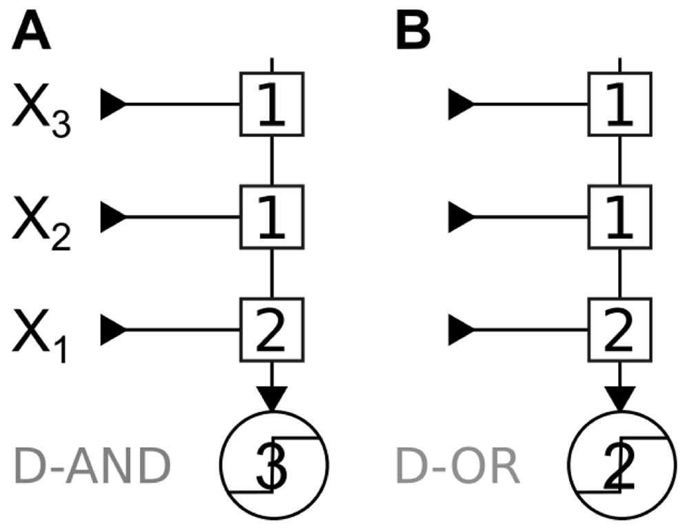 Implementations of the D-AND where X1 is the dominant input. Squares represent synapses with their synaptic weight, and circles stand for transfer functions. Here, the transfer functions are threshold functions with the given value as their threshold. A: Implementation of the D-AND, note that X1 has twice the synaptic weight compared to the others. B: Implementation of the D-OR, note that we keep the same synaptic architecture and we only change the threshold of the transfer function.