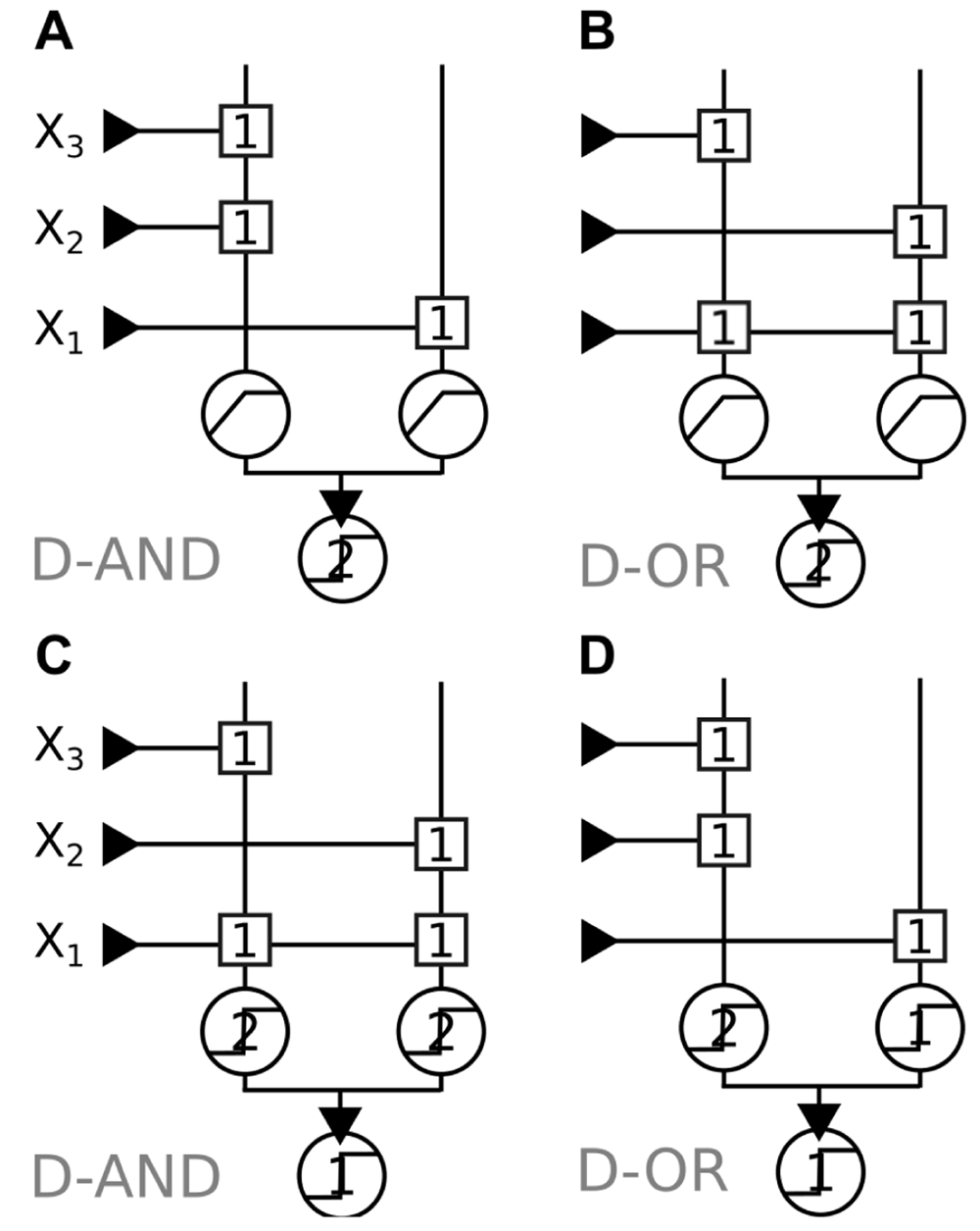 The D-AND computation gets its name from the fact that it requires the activation of a dominant (D) input AND the activation of another input. The D-OR is the Boolean dual of the D-AND, i.e. obtained by replacing AND operations by OR, and vice versa. In this computation, activation of the dominant input OR of the two other inputs together triggers an output. Both computations have a “dominant input” – an input that is sufficient to make the output true (D-OR), respectively necessary to make the output true (D-AND). There is nothing comparable in the other three computations, which treat all inputs identically. In the present paper, we always chose X1 as the dominant input, but we could have picked X2 or X3.
