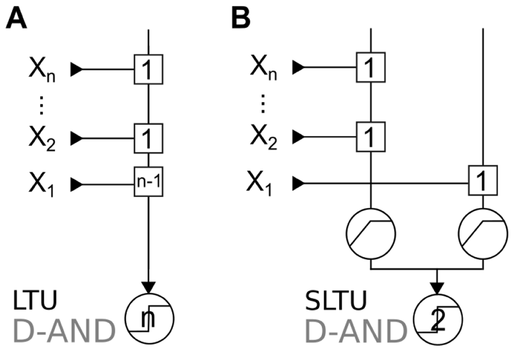 In the LTU implementation (Figure 3A), the D-AND of n variables requires that an input has a synaptic weight at least n − 1 times bigger than the other inputs, and the threshold has to grow accordingly.