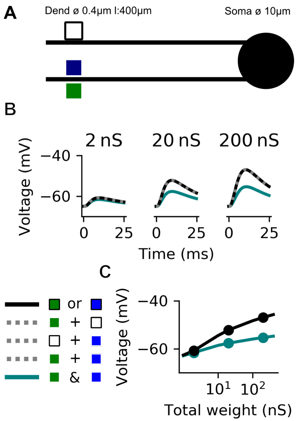 Figure 4A presents a biophysical model of a single neuron implementing the D-AND computation with three groups of synapses. All the synapses, taken individually, produce the exact same depolarisation at the soma because we place them at the same distance (350 µm) and give them the same maximal conductance (20 nS).