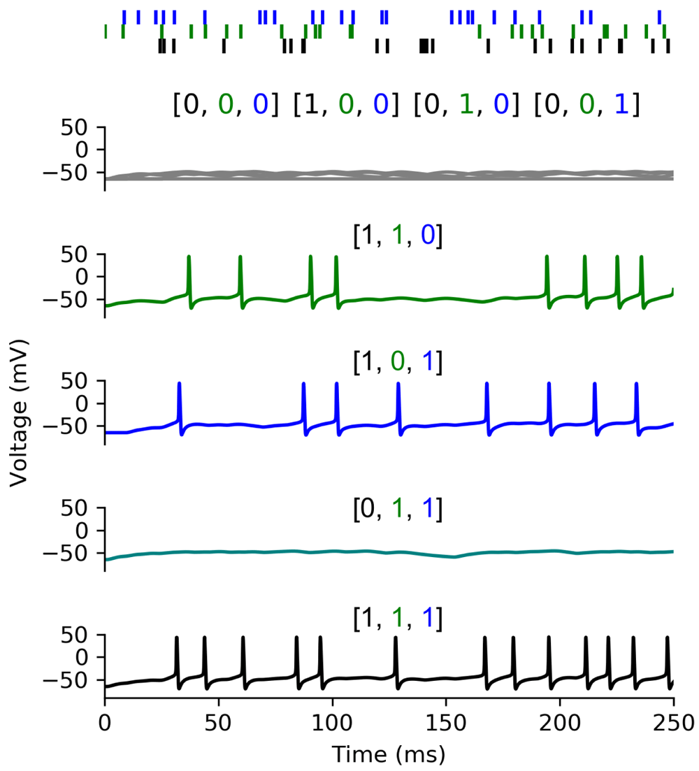 Finally, we show an implementation of the spike interpretation in Figure 6. This model is identical to the model shown previously (Figure 5), except for a slightly lower activation threshold of the sodium channels (VT = −55 mV instead of VT = −50 mV) to make it spike more easily. We discretize time into bins of 25 ms and decide randomly for each input whether it is active in each bin. If it is active, it activates at the beginning of the bin with a small temporal jitter (1 ms); inputs activating in the same bin therefore spike coincidentally. We can directly link these activations to Boolean variables that are either 0 (no spike) or 1 (spike). As Figure 6 shows, the neuron implements the D-AND and only spikes whenever the black synapses activate together with at least one of the blue or green synapses.