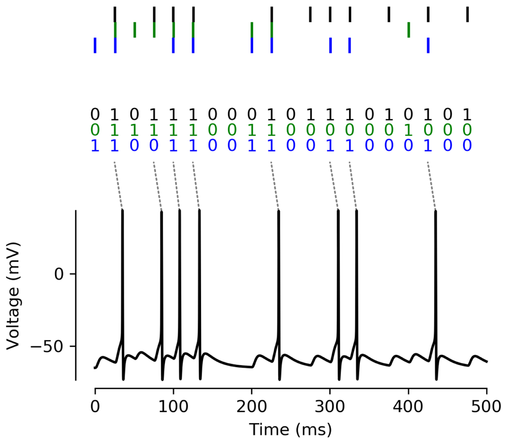 Top: The biophysical model receives input from three sources, where activation happens at regular intervals of 25 ms, with a random jitter of ±1ms for each spike. We translate this activity into a binary pattern for each time bin of 25 ms. Bottom: The model’s membrane potential as measured in the soma. The response spikes implement the output of the D-AND computation as described in Table 2.
