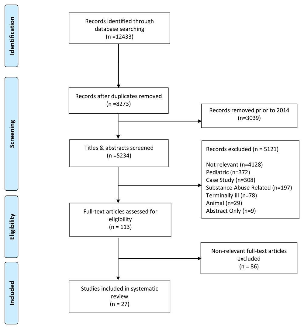 In addition to our search terms, search results were restricted to articles published in English within five years of the date of the search (Jan 1, 2014 to May 15, 2019). After retrieving articles within a ten year window as outlined in Extended Data20, the authors decided to further reduce the range to within five years. This date range was chosen in order to provide a review of the most recent developments in this field of research. After search results were compiled and duplicates were removed, a total of 5234 articles were selected for title and abstract review. Four authors (JSC, HH, MMR, RB) screened the titles and abstracts and retrieved articles for eligibility, resulting in 113 articles selected for full text review. Three authors (JSC, HH, JL) then independently reviewed the full text of eligible articles, completed data extraction worksheets adapted from the Cochrane Review Group’s Data Extraction Form (https://dplp.cochrane.org/data-extraction-forms), and assessed the articles for risk of bias using the Cochrane risk of bias tool21. Elements of the data extraction worksheet included study design and setting, participant characteristics, details of the intervention and control groups, diagnostic tools, and patient outcomes (Extended data, Supplementary Table 1)20. Any disagreements were resolved by thoroughly discussing any points of concern. During the full text review 86 articles were removed because they failed to meet our inclusion criteria resulting in a total of 27 included articles (Figure 1).
