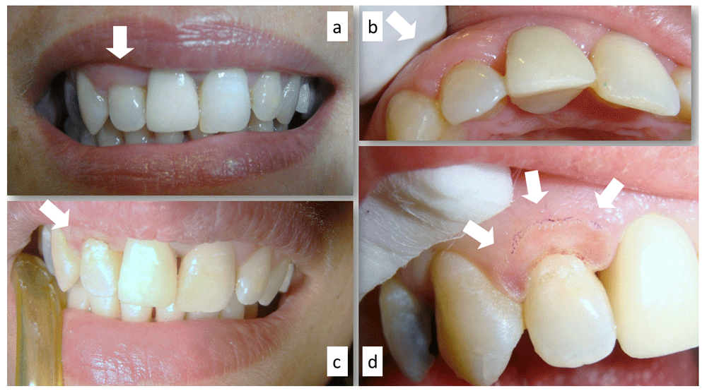 Several medical devices have been proposed to make CL less invasive, including piezosurgery4,8. Several lasers such as diode, neodymium-doped yttrium aluminum garnet (Nd:YAG), potassium titanyl phosphate (KTP), CO2, Erbium, chromium-doped yttrium, scandium, gallium and garnet (Er,Cr:YSGG) and erbium:YAG are widely used for CL1,2,6,9. However, the main difference between these is their capability to work exclusively on soft or hard or both tissues3,9,10. Diode, Nd:YAG, KTP and CO2 lasers may be useful when only gingival remodeling alone is necessary and this is essentially related to their surgical capabilities, especially contextual cuts and coagulation2,9,11,12. In fact, they are generally suggested for many surgical and non-surgical procedures in the oral cavity (frenectomy/frenulotomy, vestibuloplasty, mucosal biopsy, treatment of tooth hyper-sensibility, benign, potentially malignant and malignant lesions removal, surgical and not-surgical periodontal treatments including drug-related gingival overgrowth, photocoagulation of venous malformations, etc), but not for bone treatments12–19. When both gingival and bone remodelling is required, instead, the choice necessarily must fall on Er;Cr:YSGG or erbium:YAG lasers thanks to their selectivity for water, resulting in the capability to work by ablation on hard tissues as tooth and bone10,11,20,21. Therefore, such lasers can be used for dental cavity preparation, periodontal treatments, dentinal hypersensitivity, benign lesion removal, treatment of viral lesion of the oral mucosa and lip, gingival and/or bone remodelling or cutting7,9,10,20. In the reported cases, authors used an erbium:YAG laser both for soft and hard tissue treatment but with different tips and output energy parameters. The excellent clinical outcomes we described in terms of minimal invasiveness, lack of intra- and post-operative complications and pain, fast and predictable healing, are essentially related to the intrinsic proprieties of the erbium:YAG laser light and to the generally recognized gentle laser-oral tissues interaction10,11,20–22.