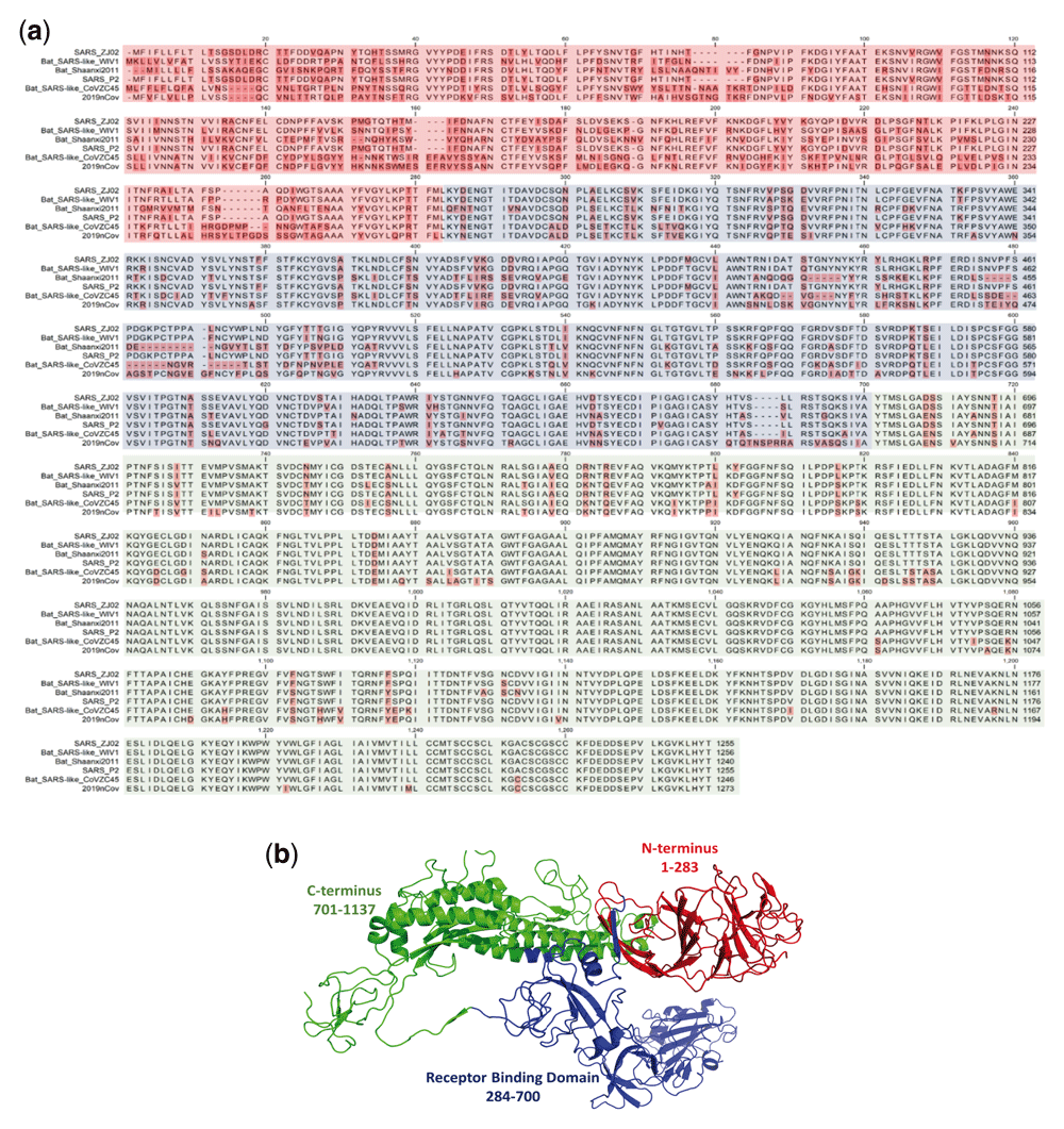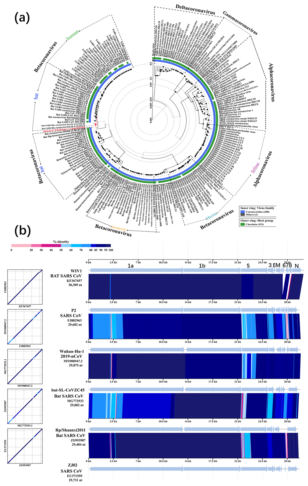 (a) Phylogenetic tree of coronaviruses from different species. The type of coronovirus and the host were labelled. Virus labeled with red is the newly discovered coronovirus 2019-nCoV. (b) Sequence alignment of representative the new 2019-nCoV, bat SARS like coronoviruses and bat coronoviruses. These included two highly homologous human SARS coronaviruses: SARS CoV P2 (FJ882963) and SARS CoV ZJ02 (EU371559), one bat SARS virus showing high homology with human SARS virus and similar potential to infect human as human SARS coronavirus: bat SARS CoV W1V1 (KF367457), two bat SARS-like viruses that are not able to infect human: (bat-SL-CoVZX45 and Rp Shaanxi2011) and the newly discovered 2019-nCoV from Wuhan.