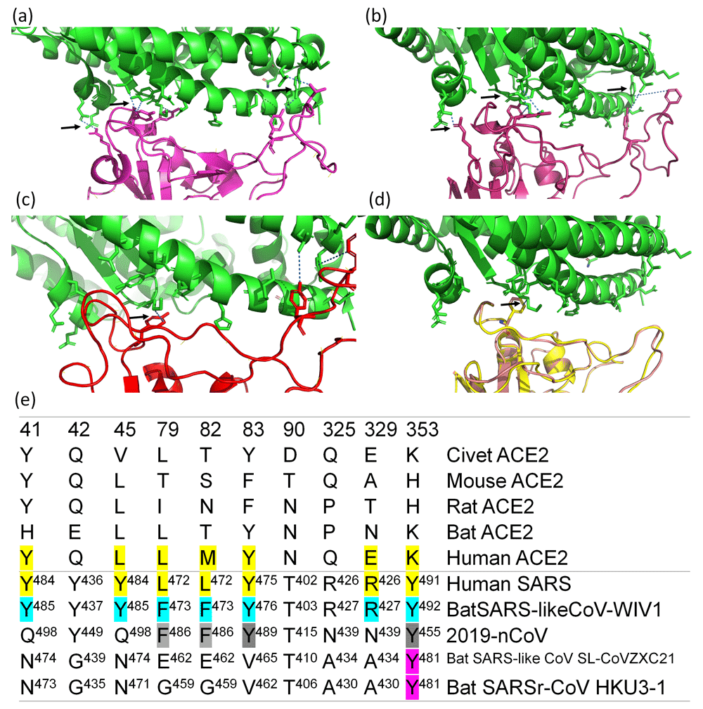 Interactions between ACE2 with RBD of human SARS virus (a), highly similar bat SARS like coronavirus, CoV-W1V1 that can infect human (b), new type of coronavirus, 2019-nCoV (c), bat SARS like coronavirus CoV SL-CoVZXC21 and bat coronavirus HKU3-1 (d) are shown. The detailed amino acid interaction sites between these two proteins are shown in (e). Arrows showed the areas with interacted residues from both proteins. Amino acid highlighted with different colors indicated the potential interaction residues between different proteins, which was highlighted with different colors.