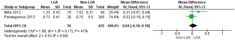 Studies and available information on the impact of VLDL on LGA remain unclear. Nevertheless, two studies that included a total of 36 patients and 425 controls reported that there was no correlation between VLDL and LGA newborns16,17. Based on our meta-analysis, the level of maternal serum VLDL was not significantly associated with births of LGA newborns (p = 0.60) (Figure 6).
