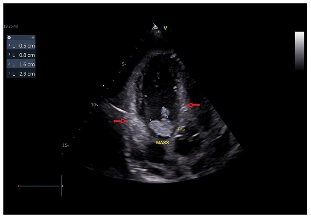 Hyperechoic areas were found in the annulus of tricuspid, lateral wall of right atrium and right ventricle, and interventricular septum (red arrows).