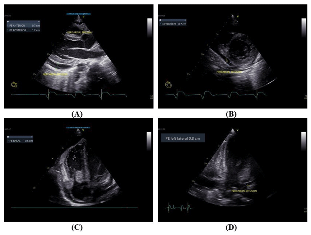 Pericardial effusion was found in (A) anterior, posterior, (B) inferior, (C) base, and (D) left-lateral of the heart.