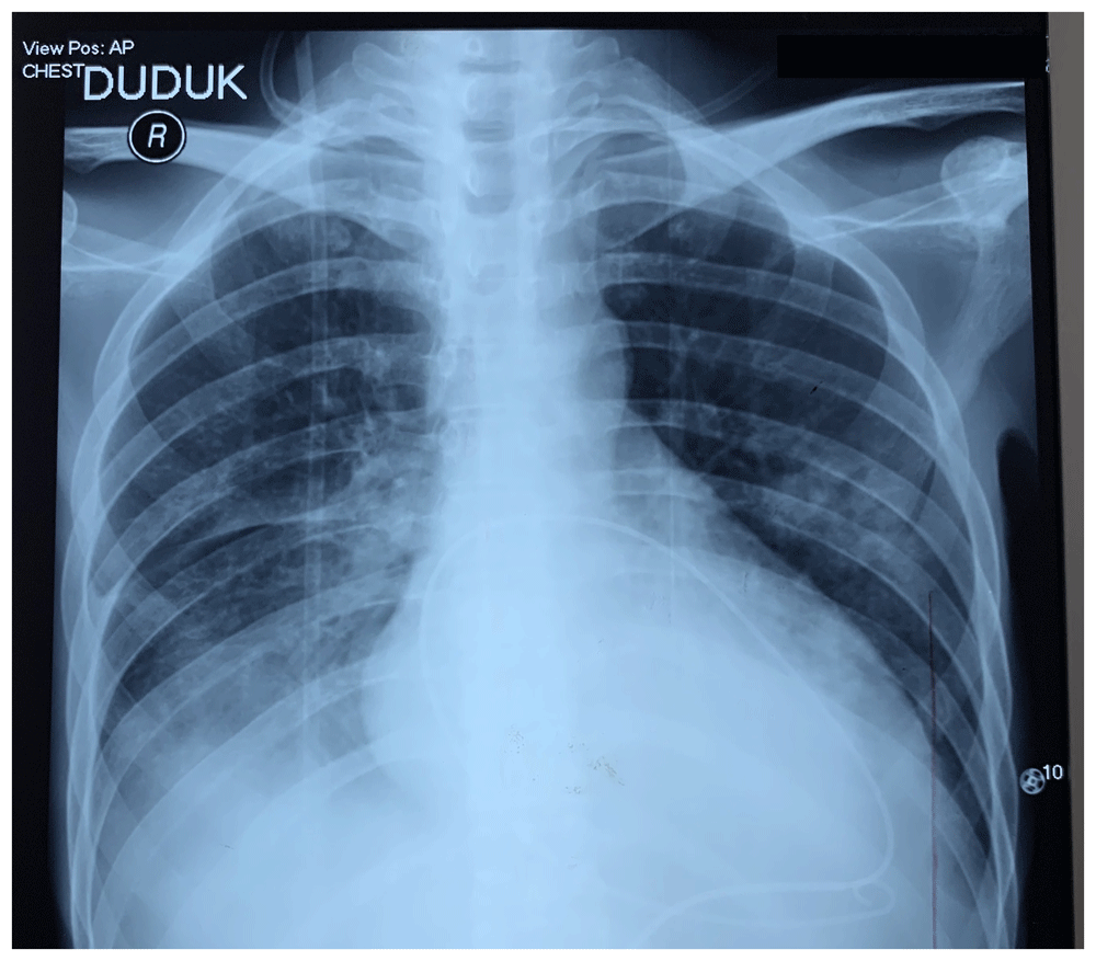 A temporary pacemaker was immediately implanted as the patient showed symptomatic heart block and cardiogenic shock. CHB persisted despite corrected electrolyte imbalance. On the 14th day of admission, the patient developed pleural effusion, and worsening pericardial effusion with echocardiogram showed massive pericardial effusion and sign of tamponade. Further chest X-ray evaluation on the 14th day of treatment (which includes electrolyte imbalance correction, supportive treatment of general weakness condition, anemia, hypoalbuminemia, and infection) showed left parahilar ground glass appearance with suspicions of lung metastasis and pleural effusion (Figure 4). Pericardiocentesis was then performed with pericardial fluid showing hemorrhagic typical for malignant disease.