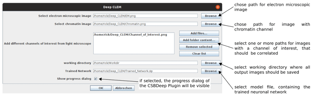 DeepCLEM requires FIJI10 with CSBDeep12 to run. The paths to the images and model file are entered in a user dialog (Figure 2). After running DeepCLEM, the correlated images and a .XML file containing the transform parameters are written to the output directory. The workflow is summarized in Figure 1; instructions for installing and running DeepCLEM and for training custom networks are included in the repository.