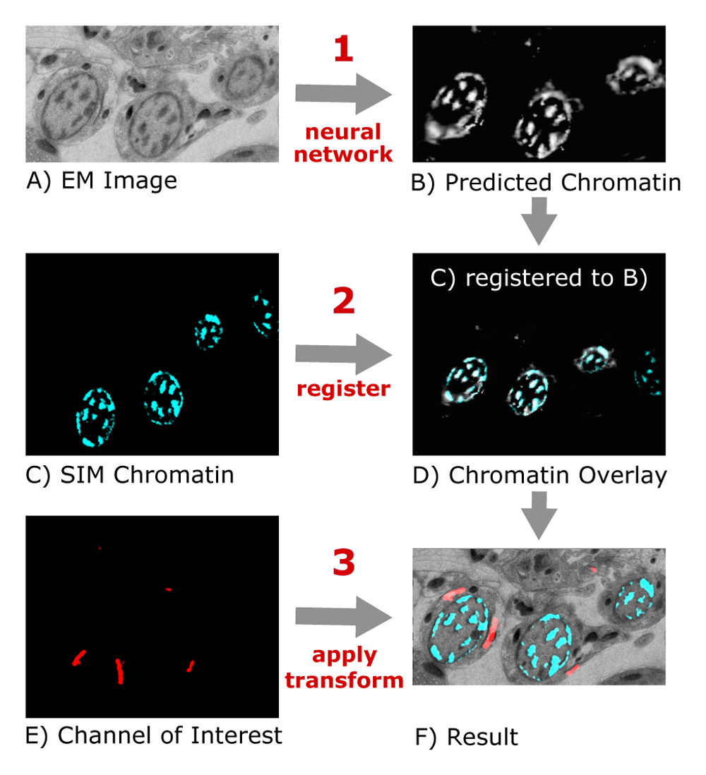 We show here that this approach can be used to predict the fluorescent chromatin stain in electron microscopy images of cell nuclei. The predicted “in silico” chromatin images are sufficiently similar to real experimental chromatin images acquired with SIM to use them for automated correlation-based registration of CLEM images. Based on this observation, we developed “DeepCLEM”, a fully automated CLEM registration workflow implemented in Fiji10 and based on CNNs.