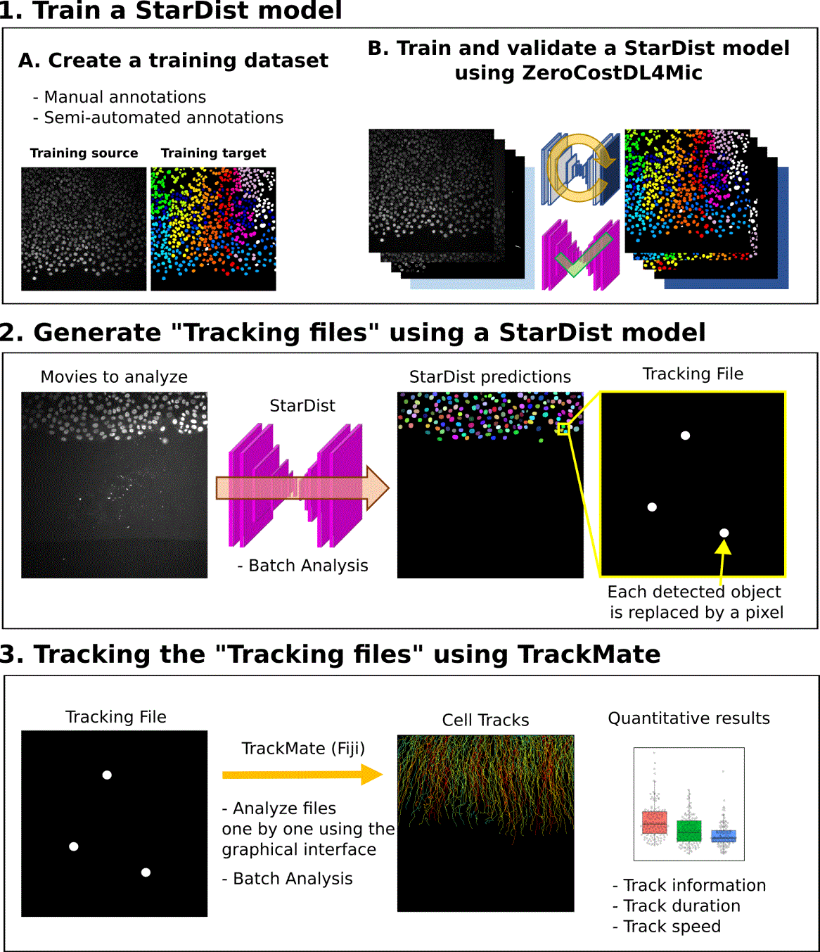 The use of deep learning networks, such as StarDist, often requires the user to train or retrain a model using their images. While high-quality StarDist pre-trained models are readily available, they are likely to underperform when used on different data with, e.g., different staining, noise, and microscope type15. To train StarDist models, we took advantage of the ZeroCostDL4Mic platform, allowing researchers to train (and retrain), validate, and use deep learning networks15. Importantly, the ZeroCostDL4Mic StarDist 2D notebook can directly output a file containing all the nuclei's geometric center coordinates (named tracking files), that can be used as input for TrackMate (Figure 1). Therefore, our proposed pipeline can be divided into three parts (Figure 1; Extended data16). 1) First, a StarDist model is trained using the ZeroCostDL4Mic platform. This part needs to be performed only once for each type of data. 2) Second, the trained StarDist model is used to segment the object to track and generate Tracking files. 3) Finally, the tracking files can be used in TrackMate to track the identified objects.