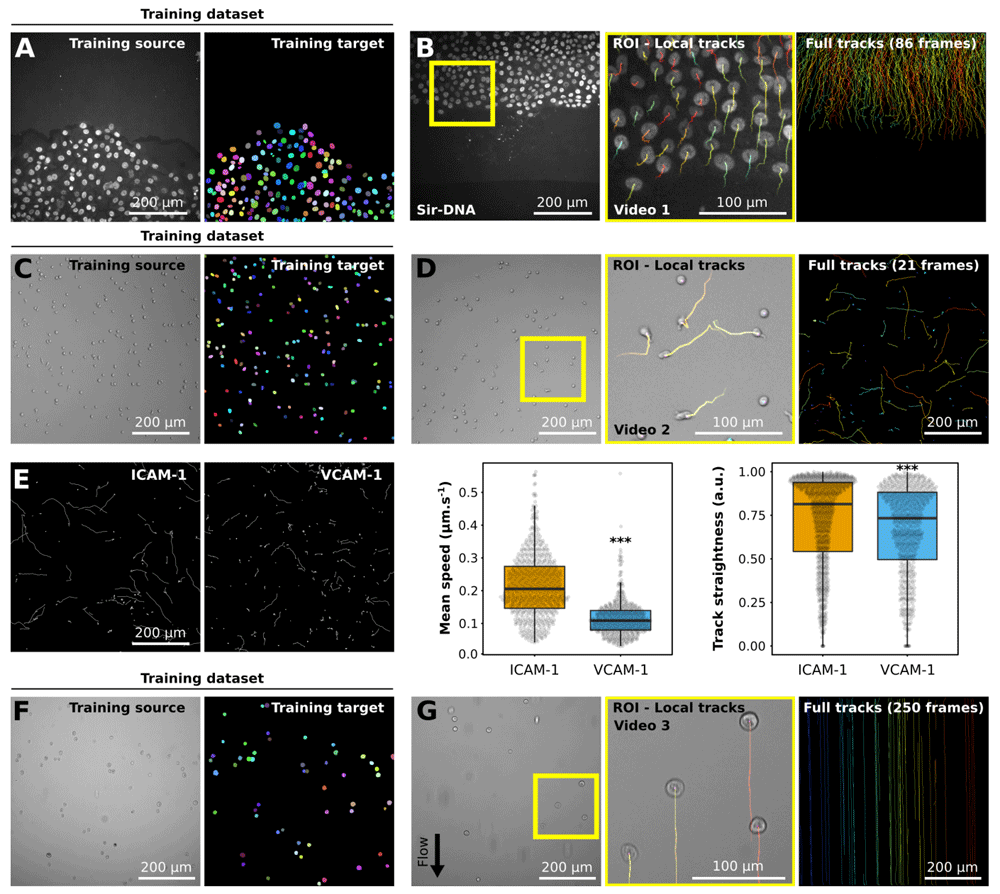 (A, B) Migration of MCF10DCIS.com, labeled with Sir-DNA, recorded using a spinning disk confocal microscope and automatically tracked. Examples of images used to train StarDist (A), and an example of results obtained using automated tracking are displayed (B, Video 1). The yellow square indicates a magnified ROI, where the local track of each nucleus is displayed. The full cell tracks are displayed on the left. Tracks are color-coded as a function of their maximum instantaneous velocity (blue slow, red fast tracks). (C–E) Migration of activated T cell plated on VCAM-1 or ICAM-1, recorded using a brightfield microscope and automatically tracked. Examples of images used to train StarDist (C) and an example of results obtained using automated tracking are displayed (D, Video 2). (E) Comparison of the migration of activated T cells on VCAM-1 or ICAM-1. Track mean speed and track straightness were quantified. Data are displayed as boxplots. *** p-value = <0.001, p-values were determined using a randomization test. (F, G) Cancer cells flowing in a microfluidic chamber, recorded live using a brightfield microscope and automatically tracked (Video 3). Examples of images used to train StarDist (F), and an example of results obtained using automated tracking are displayed (G). The full tracks shown here were color-coded as a function of their x coordinate.
