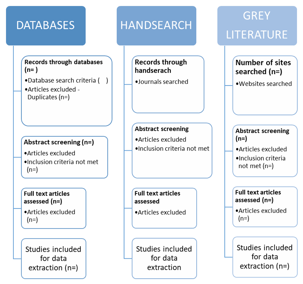 Databases and records will be screened using the eligibility criteria (see below) and studies not meeting the criteria will be excluded. The process for identification, screening, eligibility and studies to be included is displayed in Figure 1. The process of searching and selection will be reported in the main review using a PRISMA flowchart74.