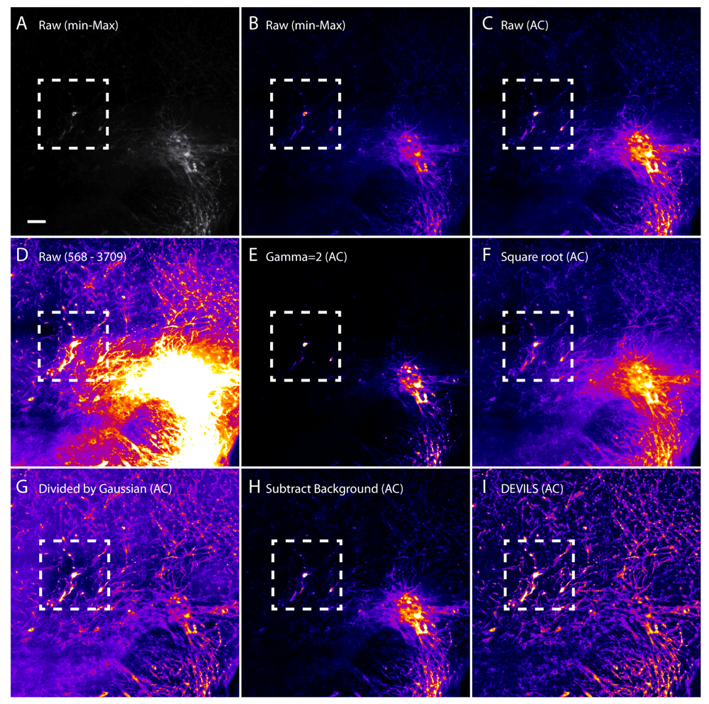 An optical slice of a chemically cleared mouse midbrain was imaged with light-sheet fluorescence microscopy (LSFM) and different image processing operations are compared. Images are displayed using the Fire look-up table (LUT) except for A which is displayed in grey-scale. Apart from panels A, B and D, the auto contrast (AC) adjustment of Fiji was set to 0.35. (A) Unprocessed image displayed using a grey LUT with the minimum (min) and maximum (max) display settings set to the pixel histogram values (568 – 55656). Scale bar: 100 µm. (B) Unprocessed image displayed using the Fire LUT with the same display settings as in A. (C) Unprocessed image displayed using AC adjustment. (D) Unprocessed image displayed with min-max set to 568 – 3709 (3709 equals 1/15th of the maximal intensity). (E) Original image displayed using Gamma adjustment (=2). (F) Original image after applying the Square Root operation. (G) Original image after a division by a spatially filtered version of the image (Gaussian blur, =50). (H) Original image after applying the ‘Subtract Background’ method from Fiji/ (radius = 25 px). (I) Original image after applying the DEVILS plugin with p = 25.